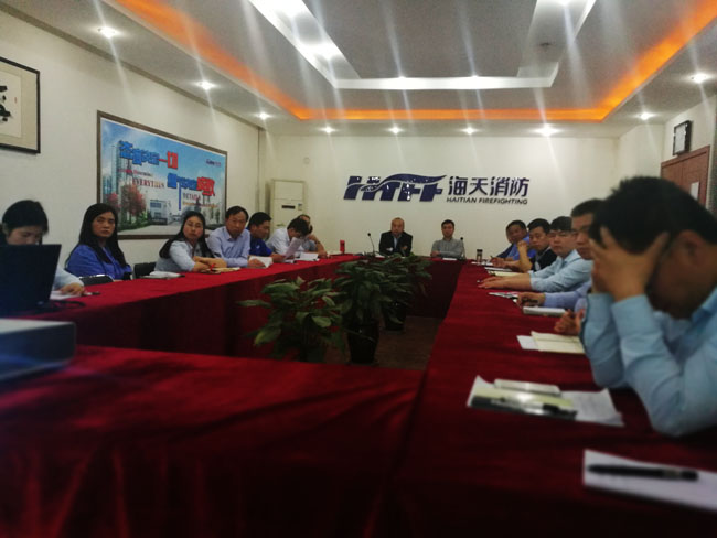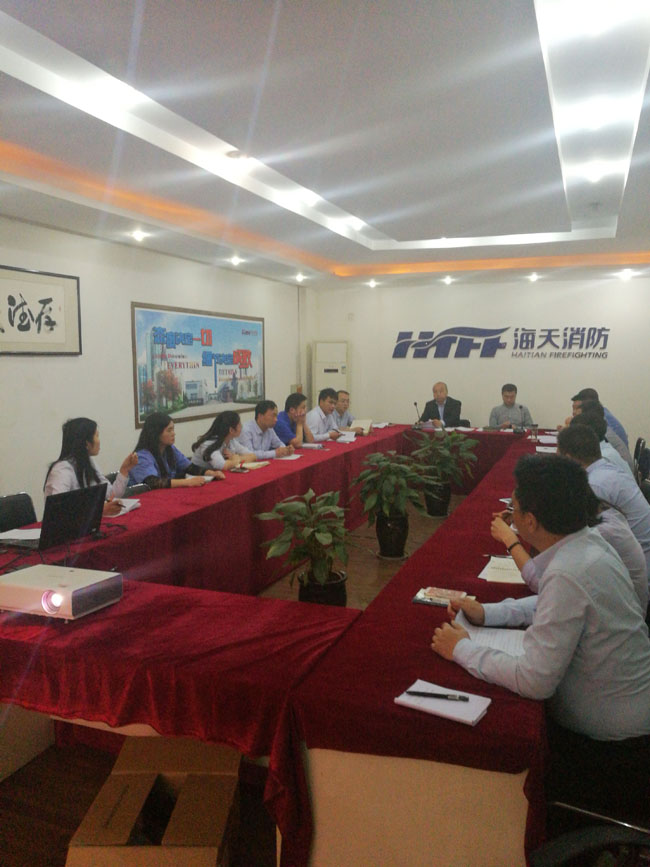4月18号下午,在海天消防二楼会议室召开了第一季度生产及业务分析会。会议由董事长李世忠先生和总经理张新权先生共同主持,全体中层管理人员参加此次会议。