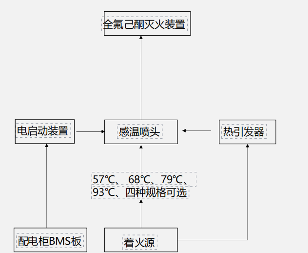 当发生火灾时,保护空间内的烟雾和温度探测器探测到异常信号时,通过报警总线向控制器发送报警信号,控制器接收到探测器传来的报警信号后,通过声光报警器向外界发出报警;并且通过控制器启动全氟己酮灭火装置,装置喷射后,将反馈信号传递至控制器。