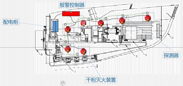 机舱内设计一套火灾报警系统,该系统主要有感温火灾探测器,烟感火灾探测报警器,声光报警器和消防控制器。系统可探测舱内温升情况,超温时感温火灾探测器会报警。当感温火灾探测器或烟感火灾探测报警器均探测火灾情况则会发出声光报警进入延时(0~30S)自动启动灭火系统或手动启动灭火系统。