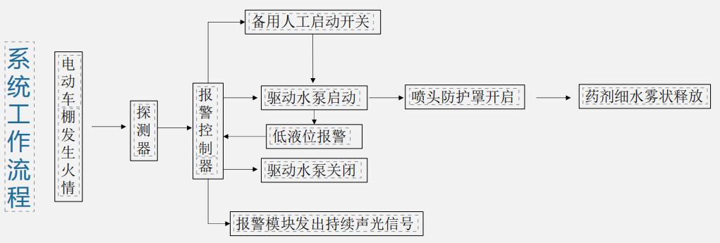 当小区电动车棚发生火灾时,细水雾系统保护空间内的烟雾和温度探测器探测到异常信号时,通过报警总线向控制器发送报警信号,控制器接收到探测器传来的报警信号后,通过声光报警器向外界发出报警;并且通过控制器启动细水雾灭火装置驱动水泵,灭火剂通过水泵经输送管路,以细水雾形式经喷头喷洒至着火部位,起到降温灭火效果。