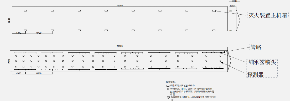 当发生火灾时,保护空间内的烟雾和温度探测器探测到异常信号时,通过报警总线向控制器发送报警信号,控制器接收到探测器传来的报警信号后,通过声光报警器向外界发出报警;并且通过控制器启动细水雾灭火装置驱动水泵,灭火剂通过水泵经输送管路,以细水雾形式经喷头喷洒至着火部位,起到降温灭火效果。
