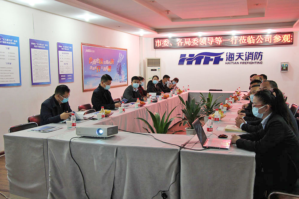 一行人来到二楼会议室,董事长李世忠首先对各领导来访表示热烈欢迎,随后一同观看了海天消防的公司介绍视频,介绍了公司经营现状和发展目标;并与领导进行了深入交流。