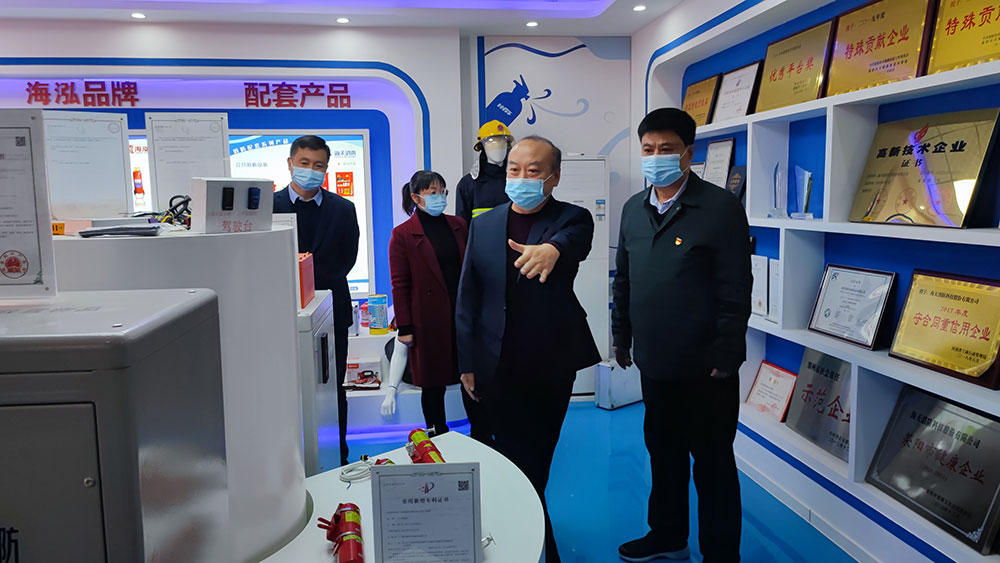 荥阳市委组织部副部长李继峰、荥阳市科工信局党组副书记、副局长曹磊等领导一行莅临海天消防调研