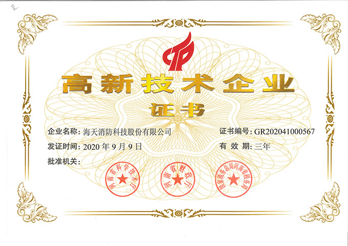 海天消防科技股份有限公司(以下简称“公司”)于2021年2月1日收到河南省科学技术厅、河南省财政厅、国家税务总局河南省税务局联合颁发的《高新技术企业证书》,公司被认定为高新技术企业,证书编号:GR202041000567,发证时间:2020年9月9日,有效期三年。