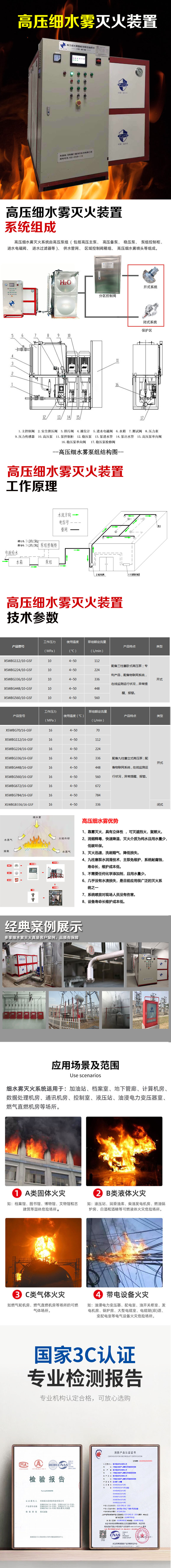 高压细水雾灭火装置是一种以水为灭火介质的灭火设备,它具有高效冷却和快速窒息的双重灭火原理,可以广泛应用于扑救A类、B类及电气火灾。该装置一般由高压主泵、备用泵、稳压泵、电磁阀、过滤器、泵控制柜、水箱组件、供水管网、区域阀箱组件、高压细水雾喷嘴、火灾报警控制系统和补水泵组成。
