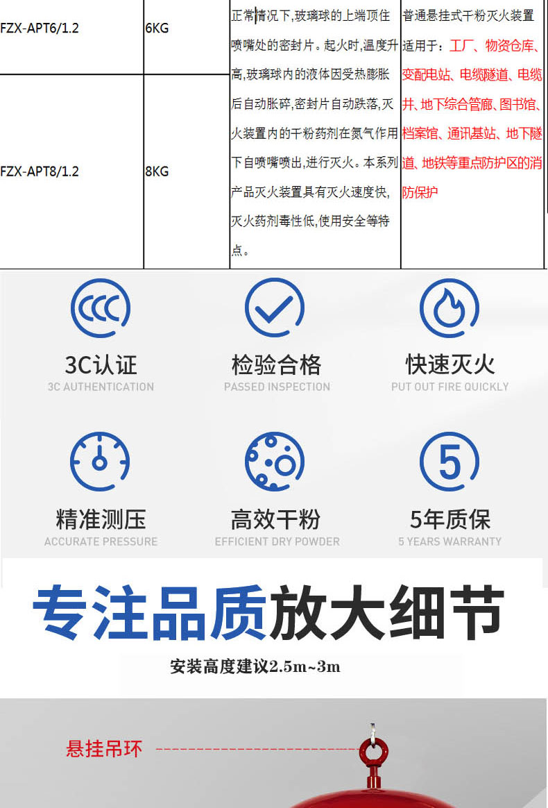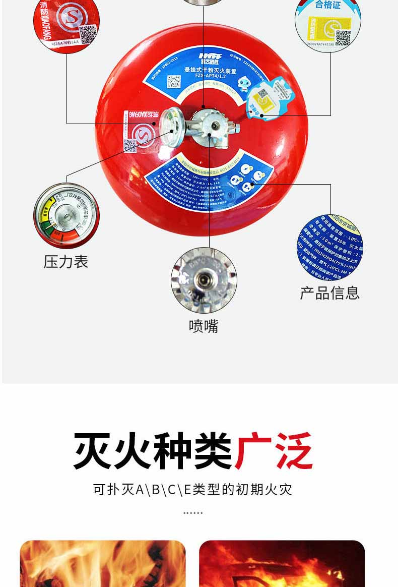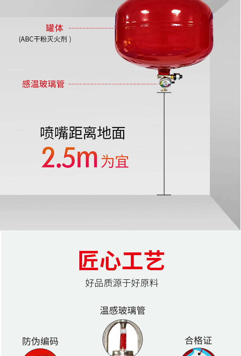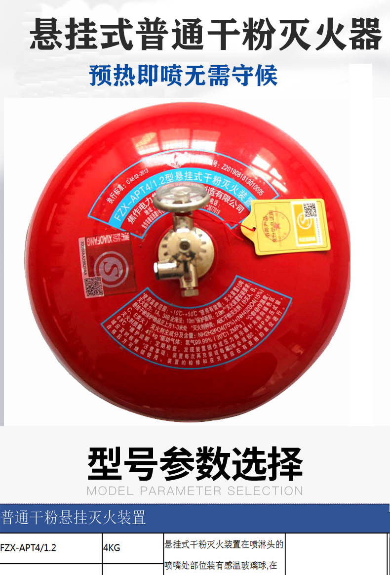 悬挂式干粉灭火装置是一种安装管廊、仓库、电缆隧道等高温易起火部位,具有一定抗震能力和适用于恶劣工作环境。当有明火或环境温度达到68℃时,灭火装置自动启动,同时还能通过选装的启动开关启动灭火装置。本装置由超细干粉灭火剂、驱动氮气、灭火剂贮罐、引发器组件等组成。